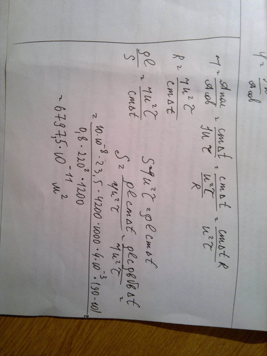 Электрический кипятильник с КПД=80процентов изготовлен из нихромовой проволоки длиной 23.5 м и включен в сеть с напряжением 220 В. За 20 мин с его помощью было нагрето 4 л воды от 10 до 90 градусов по Цельсию. Какова площадь поперечного сечения проволоки из которой был изготовлен кипятильник?