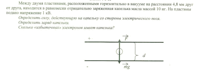 Поскольку капелька находится в равновесии, значит, сила действующая со стороны электрического поля уравновешивает силу тяжести. Следовательно