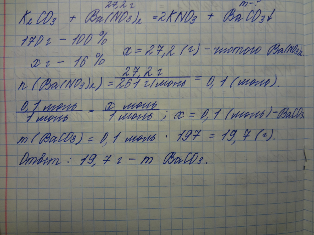 Вычислите массу осадка, выпавшего при взаимодействии избытка карбоната калия (К2СО3) со 170 г раствора нитрата бария (Ва(NO3)2 ) с массовой долей последнего 16%.