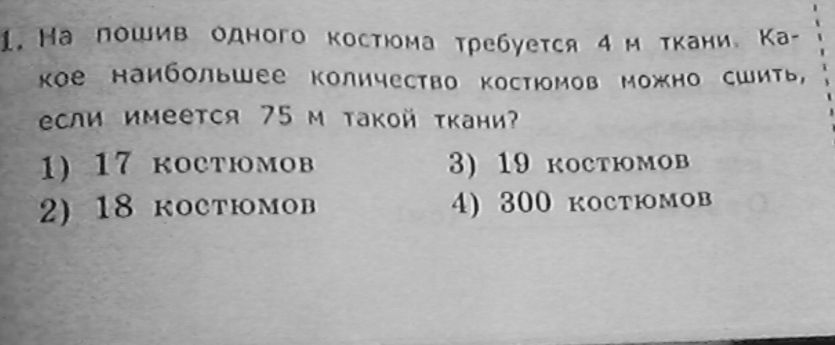75:4=18 костюмов можно сшить из75 м ткани