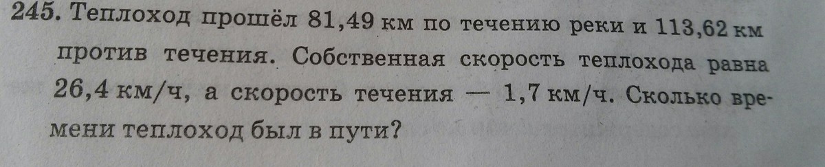1)26,4+1,7=28,1 скорость по течен. 2)26,4-1,78=24,7 -скорость против теч. 3) 81,49:28,1=2,9 (часа) 4)113,62:24,7=4,6(часа) 5)2,9+4,6=7,5 (часа) общее время в пути.