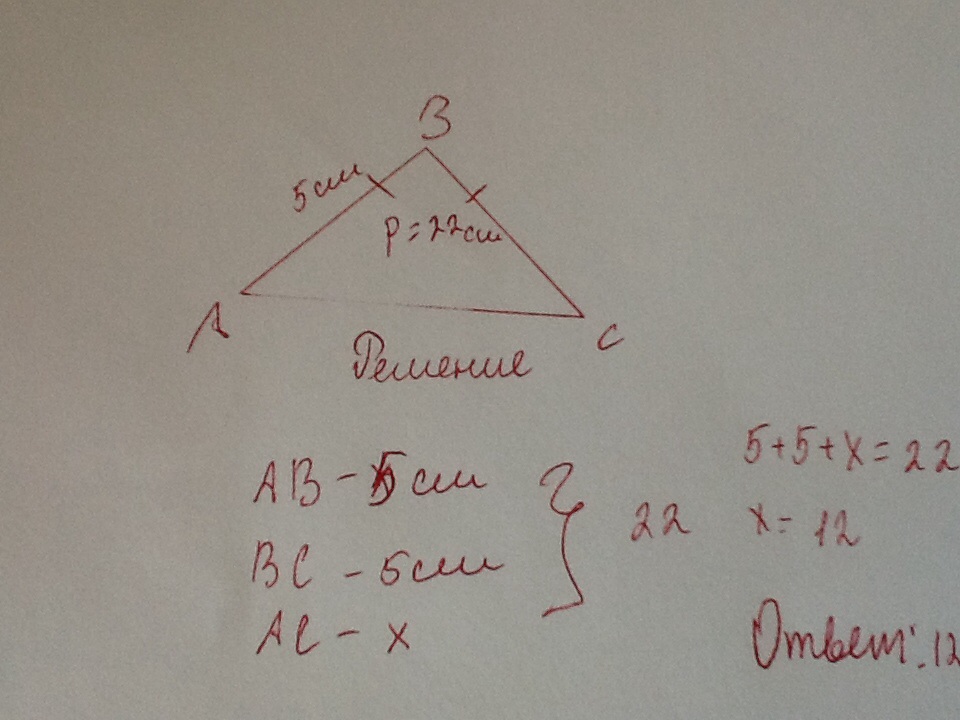 Периметр равнобедренного треуг. равен 22см. А одна из его сторон на 5 см меньше другого. Найти сумму боковых сторон