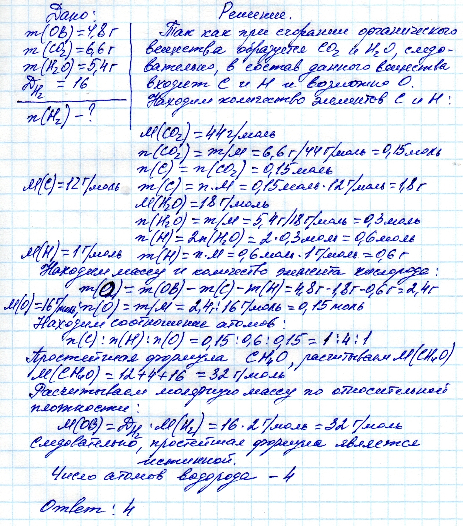 При сгорании органического вещества массой 4.8г получили 6.6г оксида углерода (4) и 5.4г воды. Плотность паров вещества по вводороду равна 16. Число атомов водорода в молекуле вещества равно:
