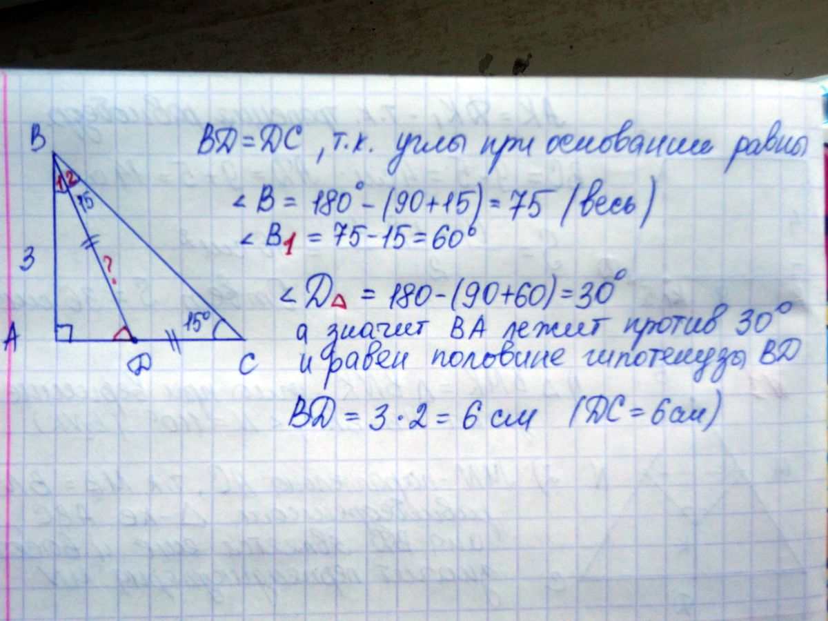 3. В прямоугольном треугольникеABC катет АВ равен3 см, угол С равен15°. На катете АС отмечена точкаD так, что ∠ CBD =15°.