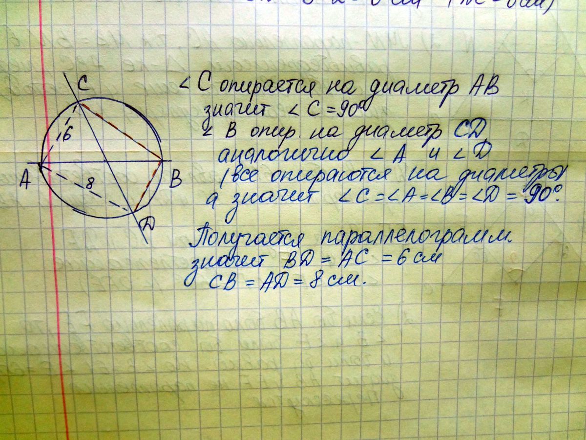 Отрезки AB и CD являются диаметрами одной окружности. Найдите хорды BC и BD если хорды AC и AD соответственно равны 6 см и 8 см