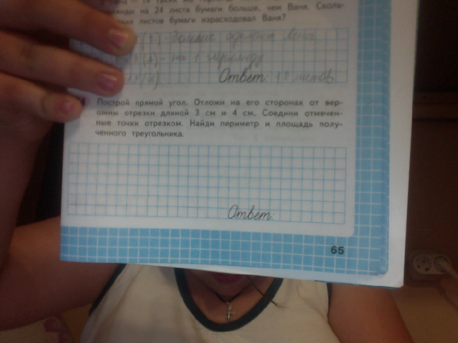 Построй прямой угол .Отложи на его сторонах от вершины отрезки длиной 3 см и 4 см.Соедини отмеченные точки отрезком.Найди периметр-(P) и площадь(S) полученного треугольника.