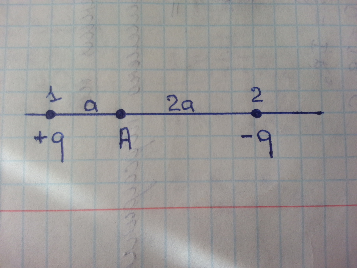 Так как вектор напряженности у обоих зарядов в точке А направлен вправо,имеем право сложить модули получившихся векторов.