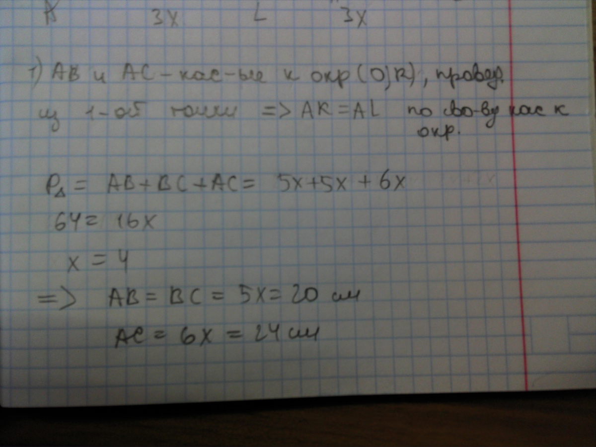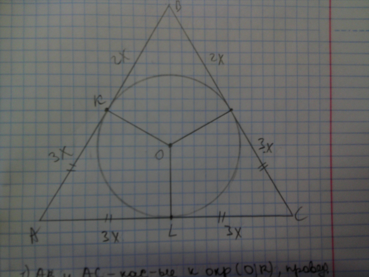 боковая сторона равнобедренного треугольника делится точкой касания вписанной окружности в отношении 3:2, считая от вершины угла при основании треугольника. Найдите стороны треугольника, если его периметр равен 64 см.