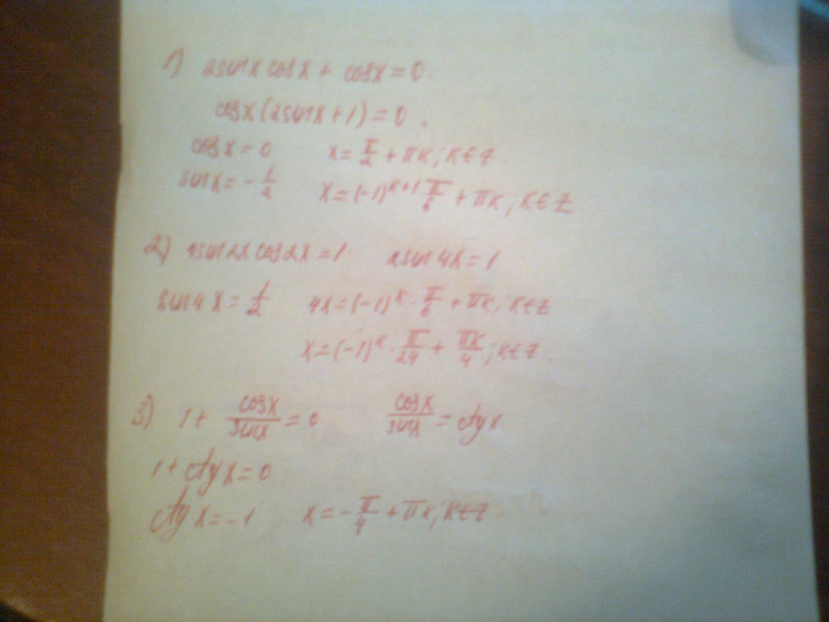 1) 2sinxcosx+cosx=0 cosx(2sinx+1)=0 x1=п/2+пк х2=((-1)^к+1)*п/6+пк