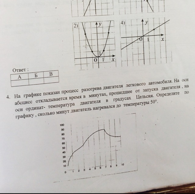 Находите по графику 50 градусов и ведете до функции. Первая встречная точка - искомая. Ведете пальцем вниз до оси Х, находите минуты. Вроде 3 минуты.