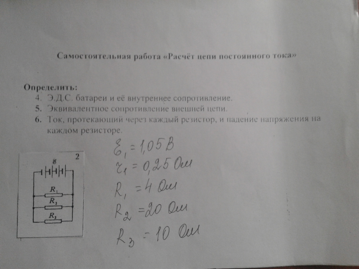 1/Rэкв= 1/R1+1/R2+1/R3=1/4+1/20+1/10=5/20+1/20+2/20=8/20 Rэкв.=20/8=2.5 Ом-эквивалентное сопротивление внешней цепи
