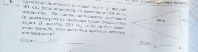 Проектор полностью освещает экран А высотой 90 см, расположенный на расстоянии 240 см от проектора. На каком наименьшем расстоянии ( в сантиметрах) от проектора нужно расположить экран В высотой 180 см, чтобы он был полностью освещён, если настройки проектора остаются неизменными?