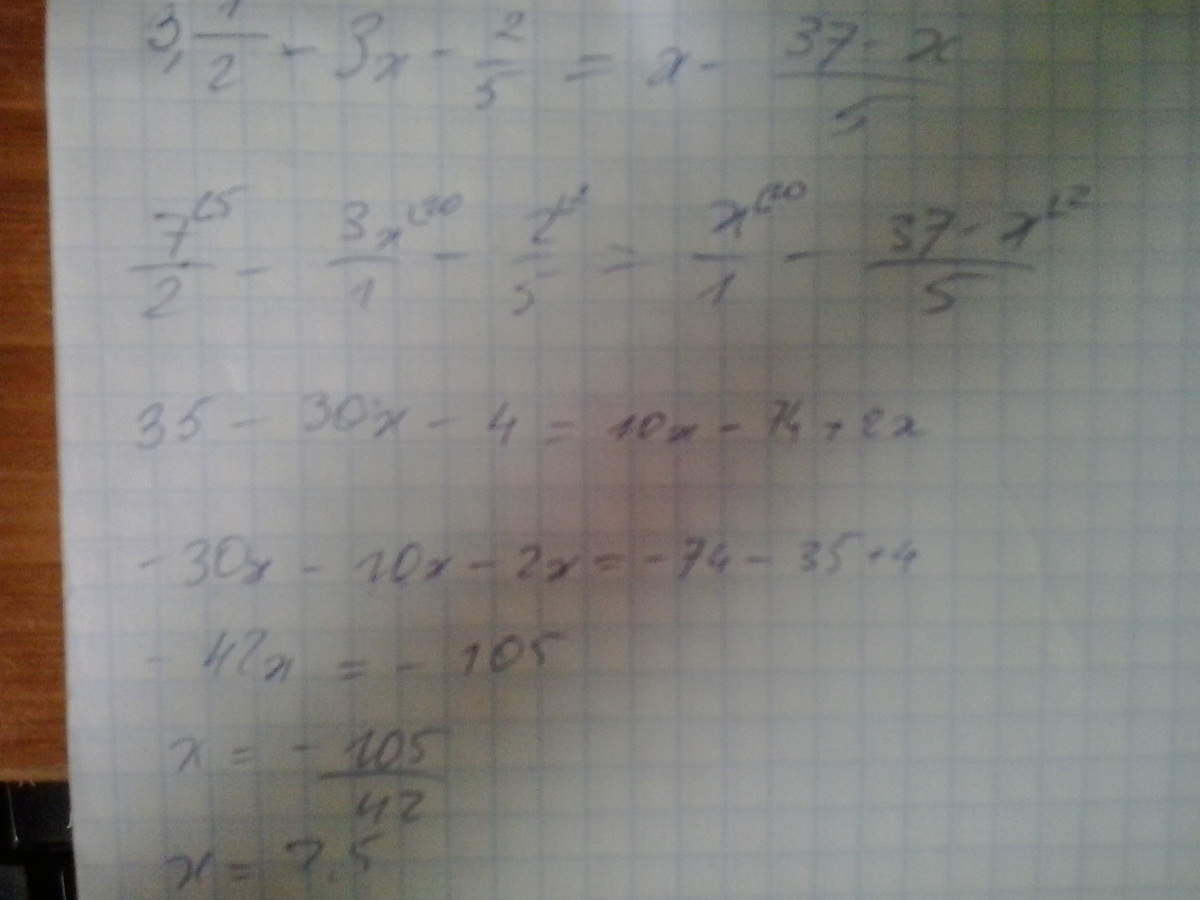 7/2 - (15х + 2)/5 = х - (37 - х) / 5 Общий знаменатель 10