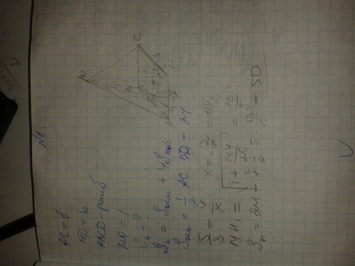 основание пирамиды ромб с диагональю 6 и 8 метров,высота пирамиды равна 1 метр ,вычислите площадь полной поверхности пирамиды если все двуграные углы при основании равны.