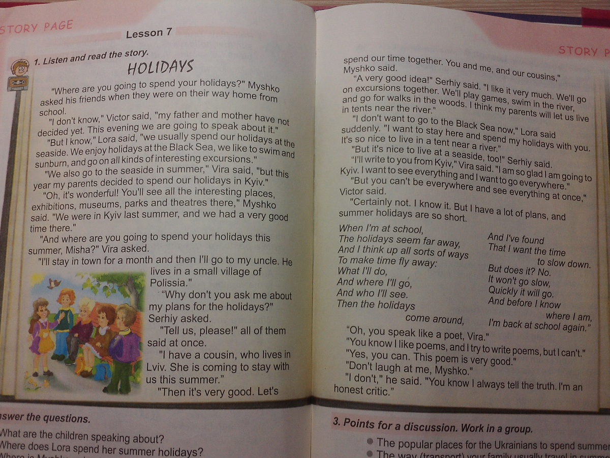 " А где вы собираетесь проводить каникулы , Миша ? " спросила Вера ."Я останусь в городе на месяц , а потом я поеду к дяде . Он живет в маленьком селе на Полесье ." Почему вы не спрашиваете где я проведу каникулы?" спросил Сергей .