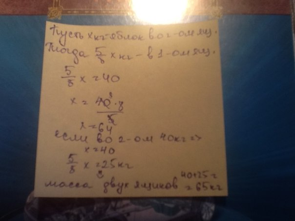 масса яблок в 1 ящике составляет 5/8 массы яблок во 2 ящике какова масса 2 ящиков яблок,если во втором 40 кг.