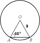 Радиусы в окружности равны, значит, OA=OB=8, поэтому треугольник AOB - равнобедренный, следовательно, угол OBA= 60 градусов. Угол AOB= 180-(60+60)=60гр. Тогда все углы в треугольнике равны (по 60 градусов). Значит, треугольник равносторонний и AB=8