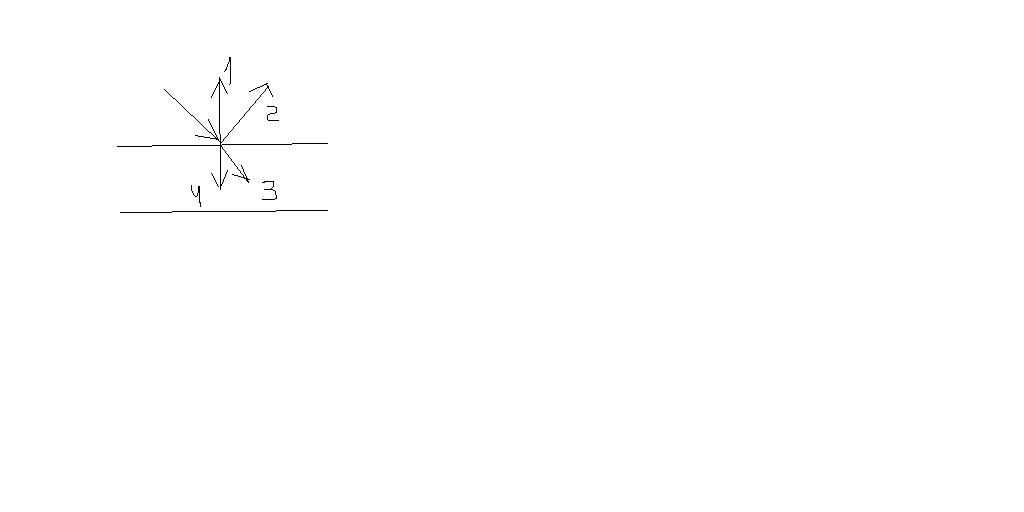 При переходе из одной среды в другую (с различными оптическими плотностями), свет преломляется всегда. Преломляется он отклоняясь в сторону большей оптической плотности. Здесь - преломленный луч - 4. При переходе из стекла в воздух он снова "преломится" и приобретет прежнее направление.