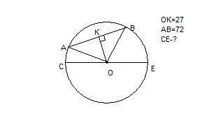Расстояние от точки до прямой - длина перпендикуляра от этой точки до прямой. Поэтому строим отрезок ОК, длина которого 27. Построим отрезки ОА и ОВ к концам хорды. Треугольник АОВ - равнобедренный, т.к. ОА=ОВ=r.