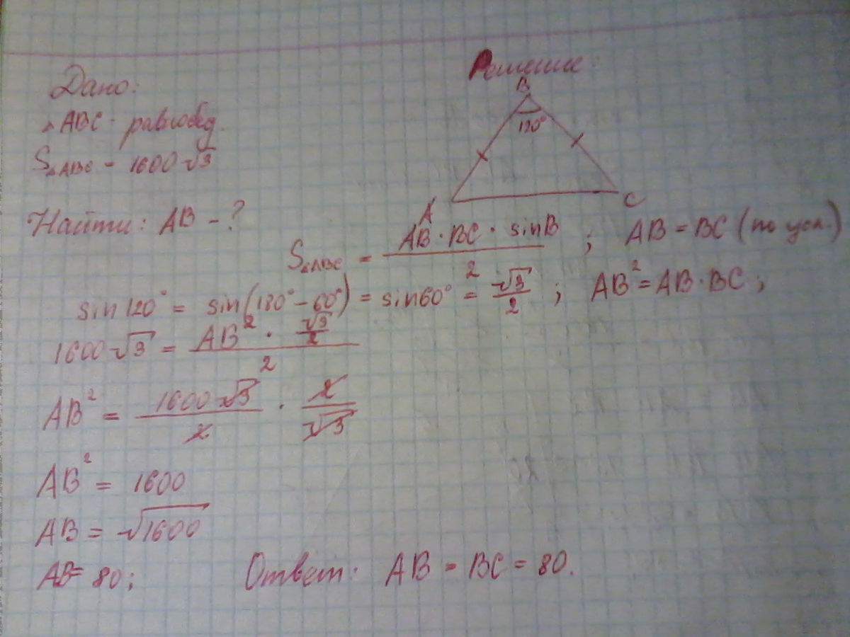 Площадь равнобедренного треугольника равна 1600√.3 Угол, лежащий напротив основания, равен 120∘. Найдите длину боковой стороны.