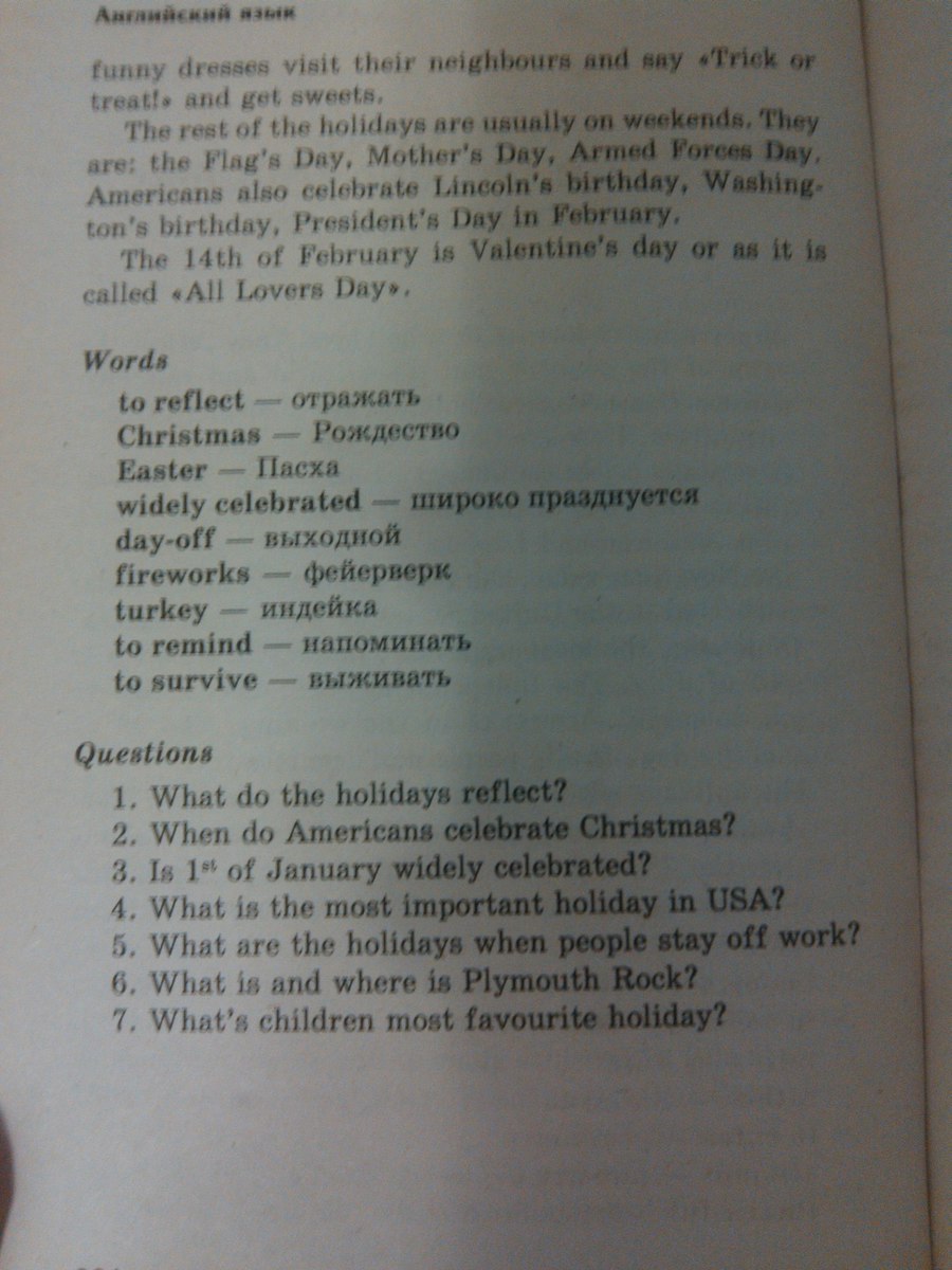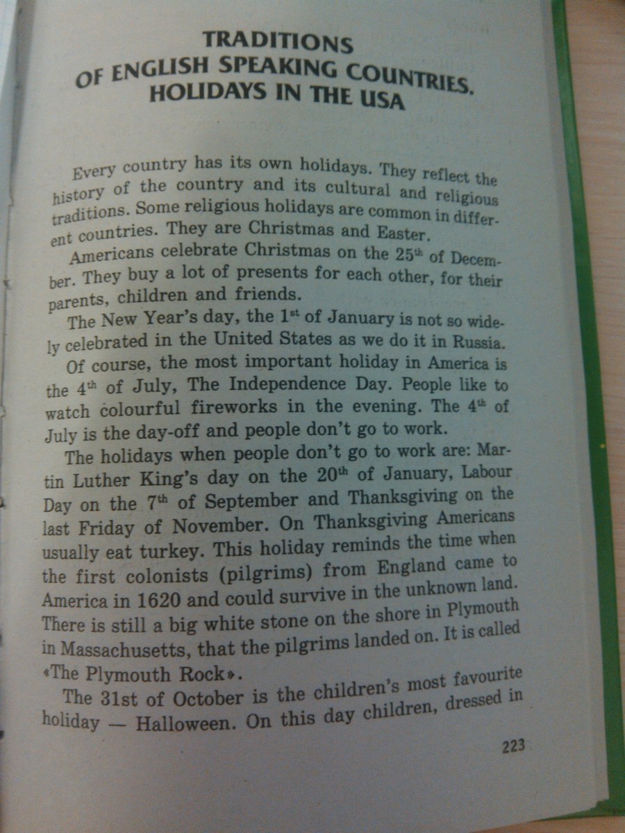 Праздники, в которые люди не ходят на работу - это день короля Мартина Лютера 20 января, день труда 7 сентября и день благодарения в последнюю пятницу ноября. В день благодарения американцы обычно едят индейку. Этот праздник напоминает время, когда первые колонисты (паломники) пришли из Англии в Америку и могли выжить на неизвестной земле. До сих пор есть большой белый камень на берегу Плимута штата Массачусетс, на котором паломники сделали посадку. Он назван "Плимутский камень".