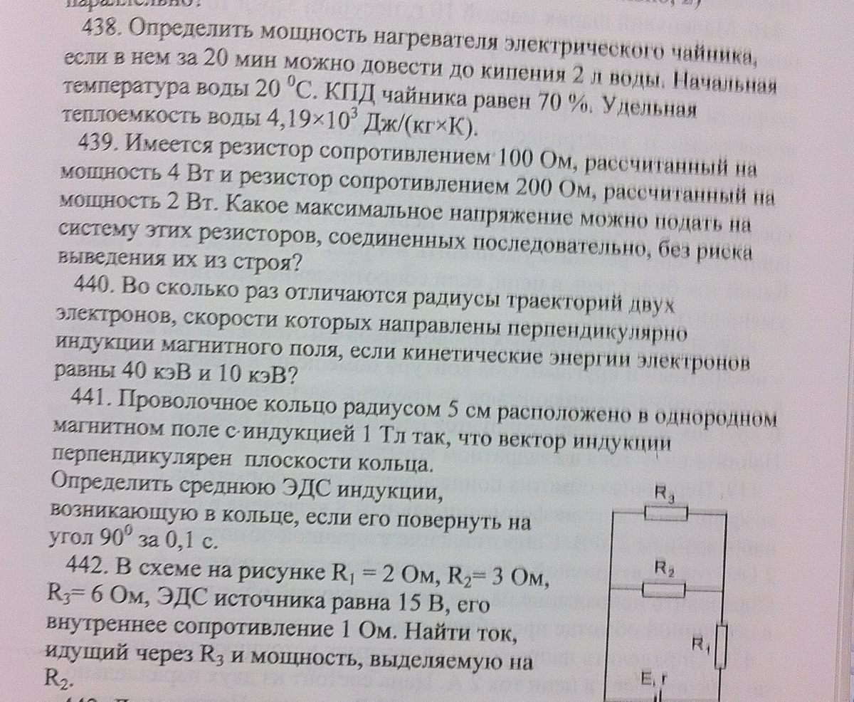 442 В схеме на рисунке R1=2 Ом R2 = 3 Ом R3 = 6 Ом, ЭДС источника равна 15В, его внутренне сопротивление 1 Ом. Найти ток, идущий через R3 и мощность, выделяемую на R2 .