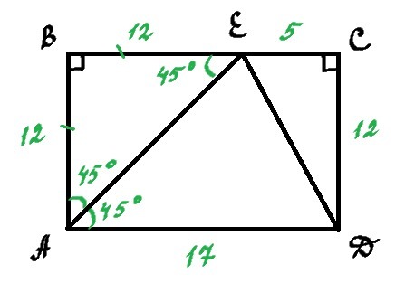 На стороне BC прямоугольника ABCD ,у которого AB =12 и AD=17,отмечена точка E так,что угол EAB=45.Найдите ED