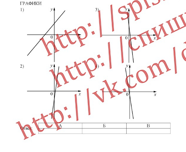 На рисунке изображены графики функций вида y=kx+b. Установите соответствие между знаками коэффициентов k и b и графиками функций.