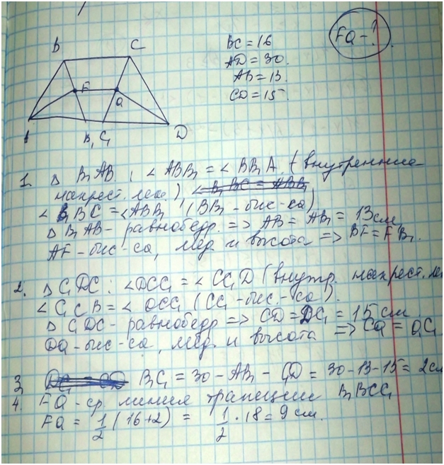 Биссектрисы углов А и В при боковой стороне АВ трапеции АВСD пересекаются в точке F. Биссектрисы углов С и D при боковой стороне СD пересекаются в точке G. Чему равно FG, если основания равны 16 и 30, боковые стороны - 13 и 15? решите пожалуйста только быстро.