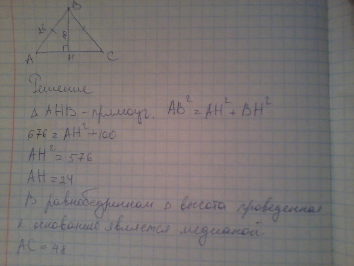 Боковая сторона равнобедренного треугольника равна 26 см, а высота треуголька , проведенная к его основанию ,-10. Вычислите площядь данного треугольника.