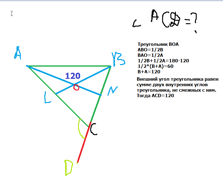 в треугольнике АВС проведены биссектрисы AN и BL , которые пересекаются в точке О. Угол АОВ равен 120 градусов . Найти внешний угол при вершине С.