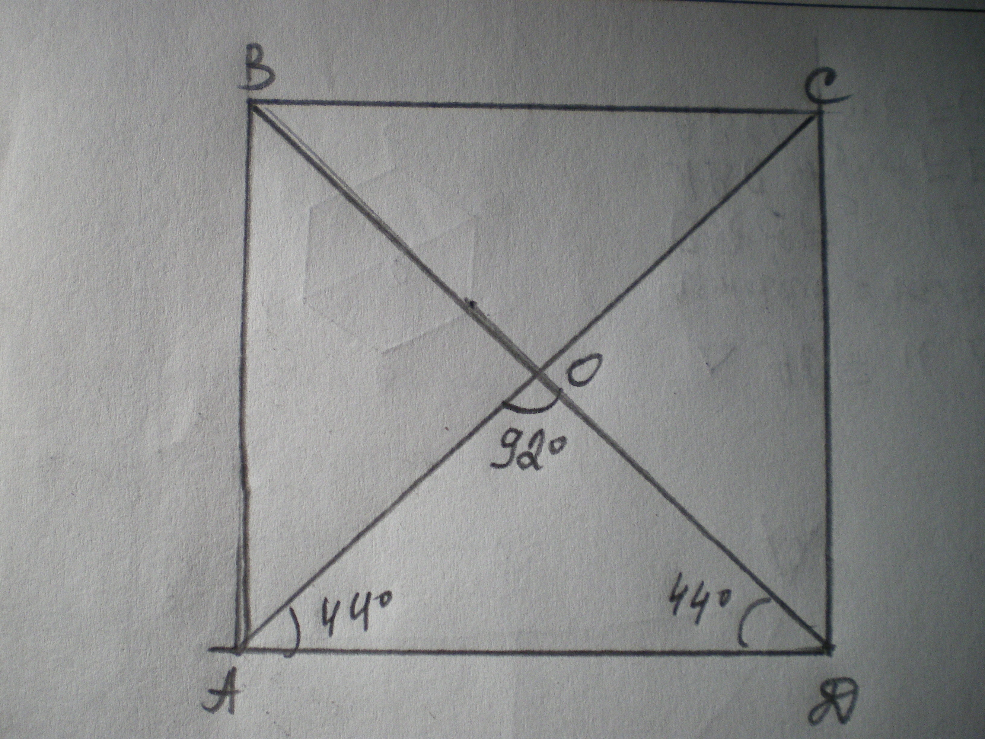 Рассмотрим ΔАОД - равнобедренный, т.к. АО=ОД. Из этого следует, что ∠САД=∠АДВ=44°. Тогда ∠АОВ=180-(44+44)=92°.
