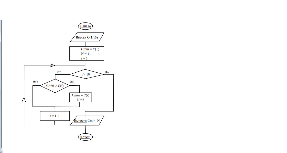 РЕБЯТ, помогите плиз с информатикой. С(10), Определить наименьший элемент массива С и его номер, С<10. Нужно нарисовать еще блок схемы, но думаю это нереально здесь, хотя-бы задания пжл