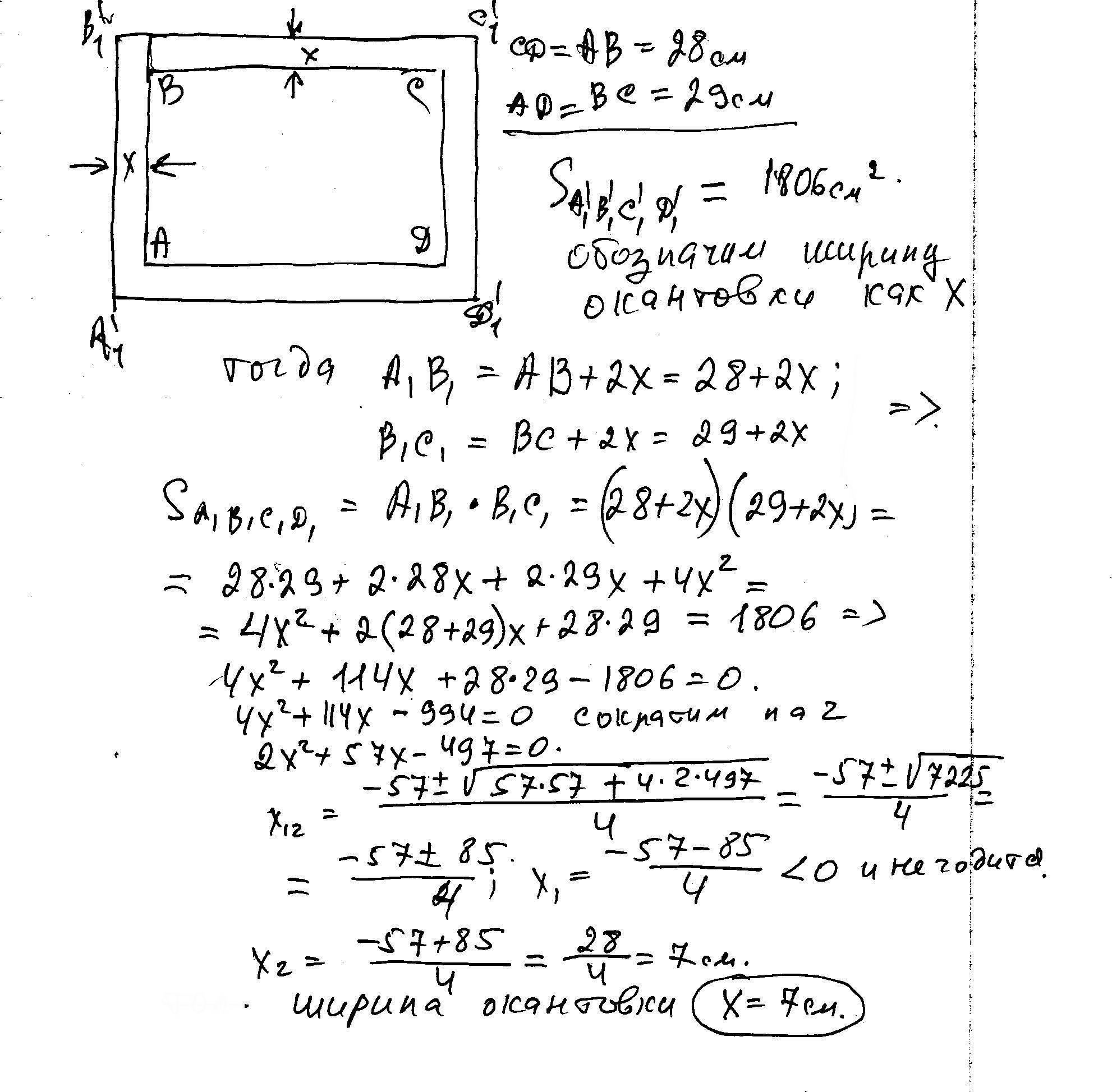 Картинка имеет форму прямоугольника со сторонами 28 см и 29 см.Её наклеили на белую бумагу так,что вокруг картинки получилась белая окантовка одинаковой ширины. Площадь,которую занимает картинка с окантовкой, равна 1806 см(2). Какова ширина окантовки?