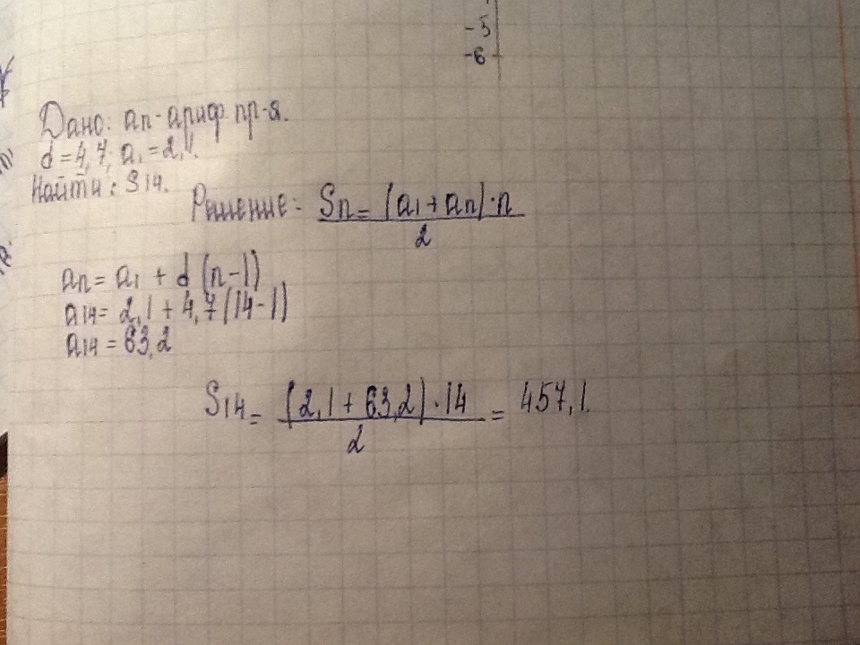 дана арифметическая прогрессия (an) разность которой равна 4,7, a1= 2,1.Найдите сумму первых 14 ее членов