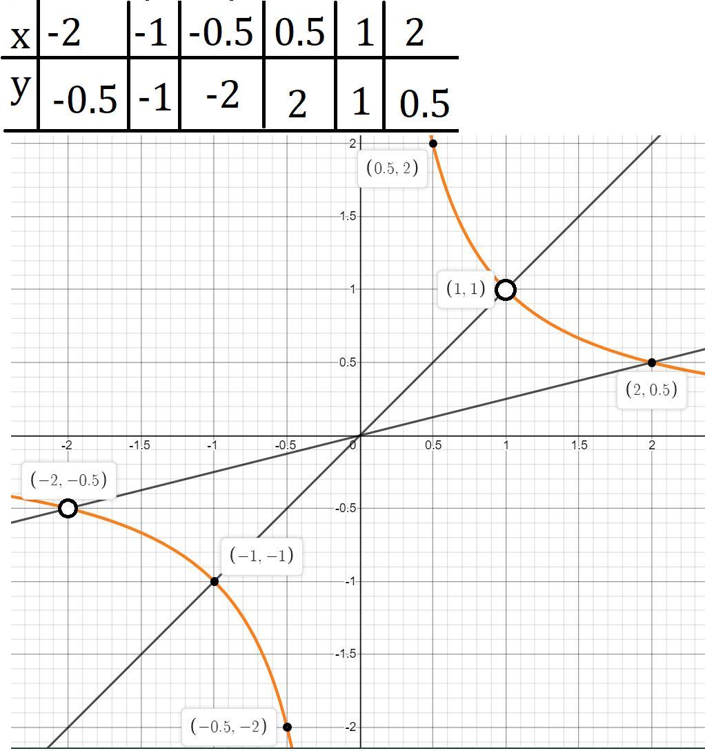 Затем построим нашу гиперболу и выкалим точки, при которых исходная функция не определена.