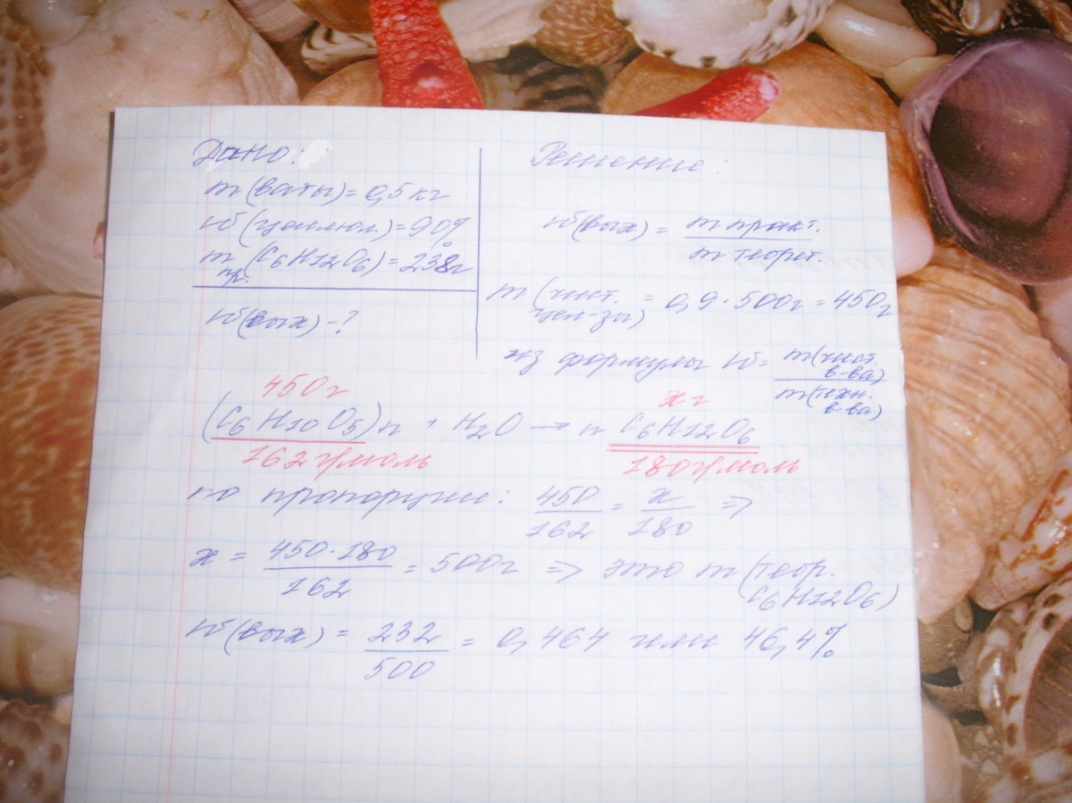 Вату массой 0,5 кг, содержащую 90% целлюлозы, подвергли кислотному гидролизу и получили глюкозу массой 238г. Вычислите практический выход (%)глюкозы.