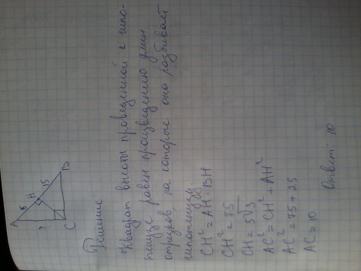 В треугольнике ABC угол C равен 90°,CH-высота.Найдите катет AC,если AH=5,а BH=15.