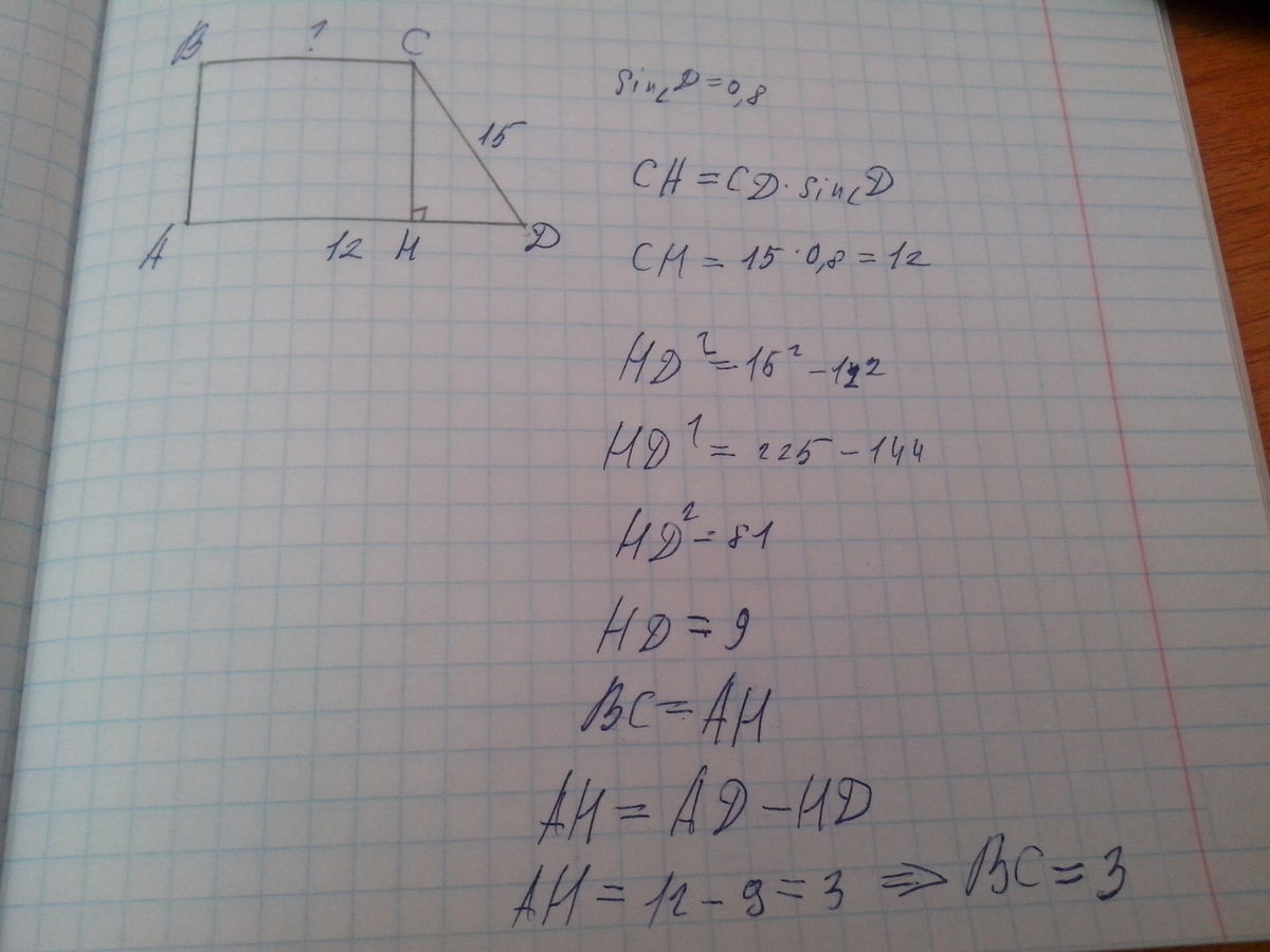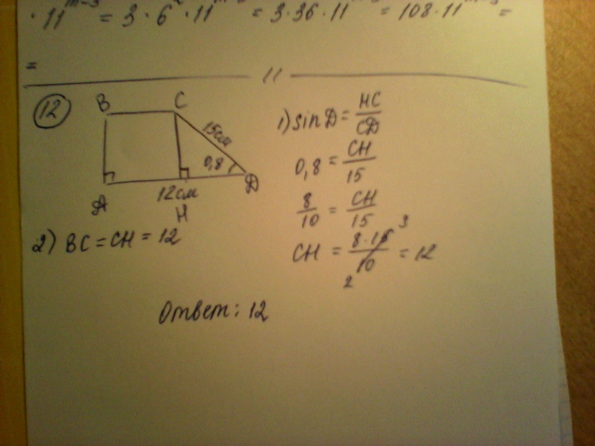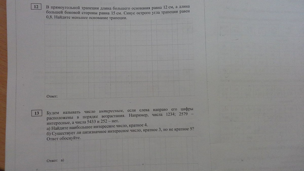 Вот 12. Ответ выше не верен, ибо нужно не высоту найти, а меньшее основание.