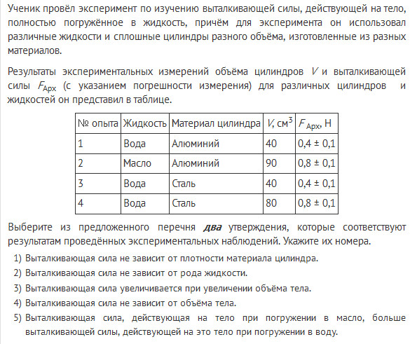 Ученик провёл эксперимент по изучению выталкивающей силы, действующей на