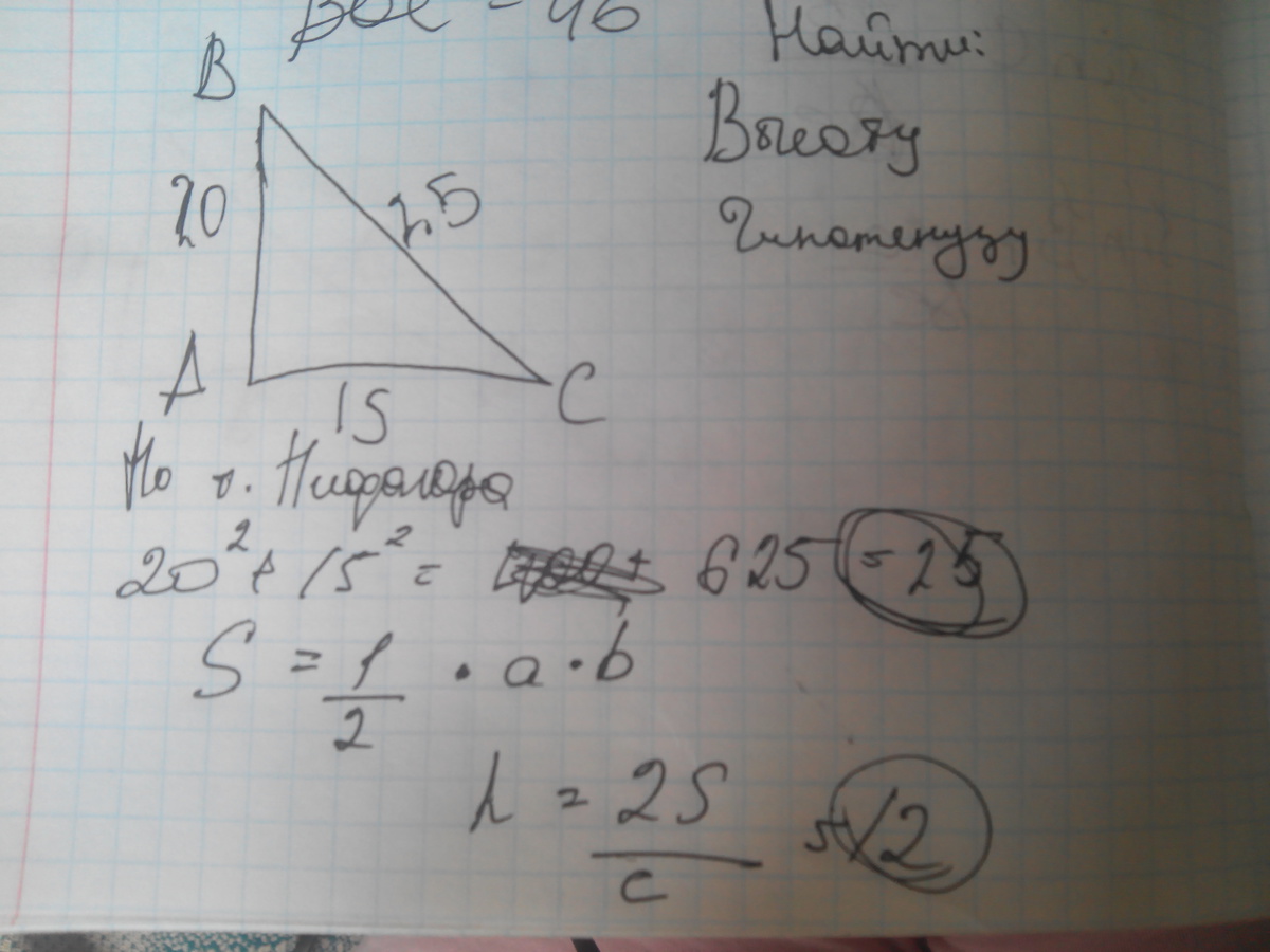 треугольник АВС, уголС=90, АС=15, ВС=20, АВ=корень(АС в квадрате+ВС в квадрате)=корень(225+400)=25, АН=АС в квадрате/АВ=225/25=9, ВН=АВ-АН=25-9=16, СН-высота=корень(АН*ВН)=корень(9*16)= 12