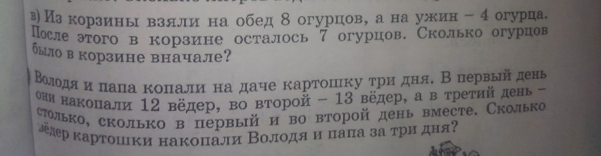8 + 4 + 7 = 19 (ог). было в корзине изначально