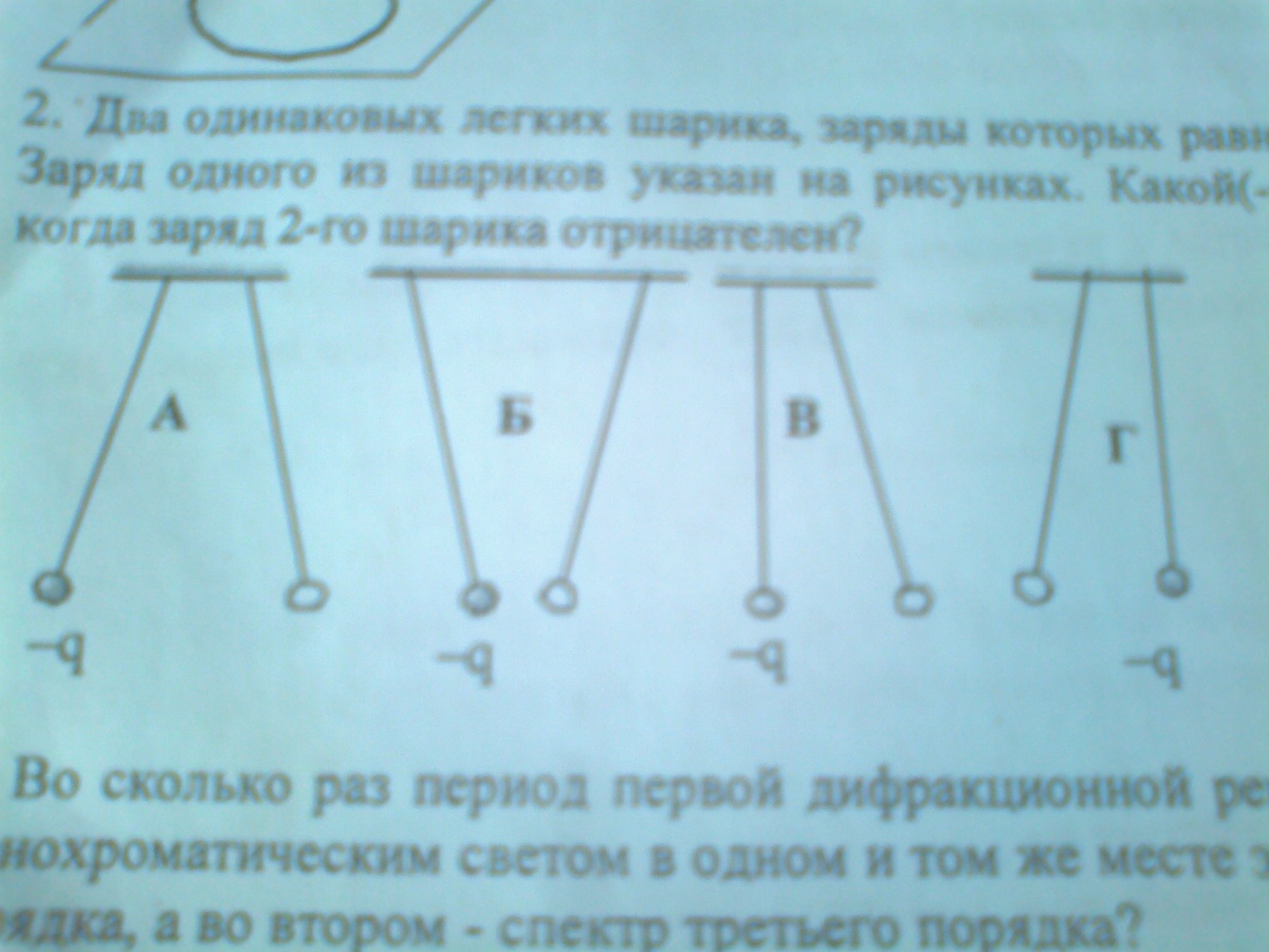 Два одинаковых лёгких шарика, заряды которых равны по модулю, подвешены на шелковых нитях. Заряд одного из шариков указан на рисунках. Какой(-ие) из рисунков соответствует(-ют) ситуации, когда заряд 2-го шарика отрицателен?