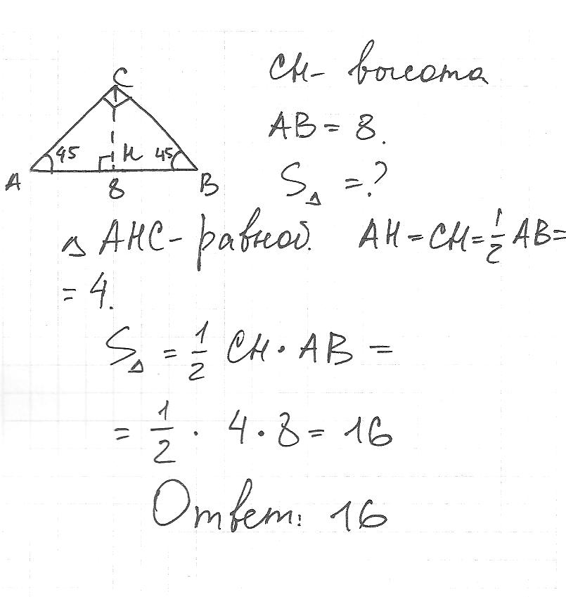 в прямоугольном треугольнике гипотенуза равна 8,а один из острых углов 45,найдите площадь треугольника