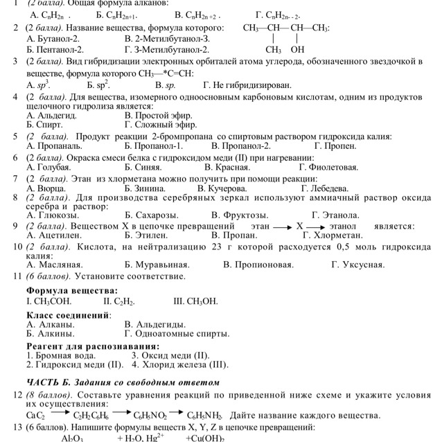 Б. Алкины. Г. Одноатомные спирты.