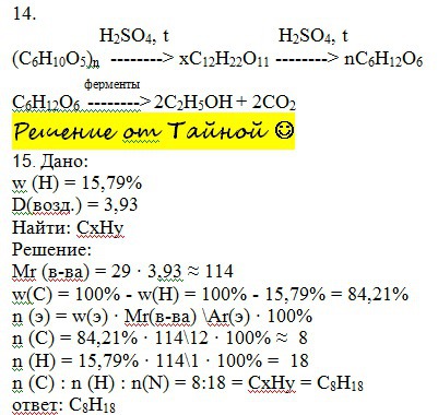 14 (4 балла). Составьте схему получения этанола из крахмала. Над стрелками переходов укажите ус- ловия осуществления реакций и формулы необходимых для этого веществ.