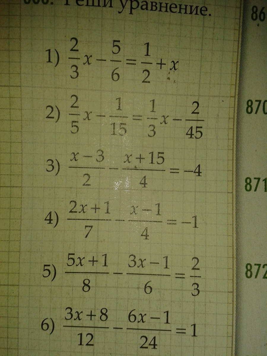 1)2/3х-х=-1/3 -1/3х=-1/3 х=1 2)2/5х-1/3х=-2/45+1/15 1/15х=1/45 х=1/3 3)2х-6-х-15=-16 х=-16+6+15 х=5 4)Чтобы было понятно: Сначала приведём дроби к общему знаменателю и получим: 8х+4-7х-7=-28 х=-28+7-4 х=25 Дерзай!