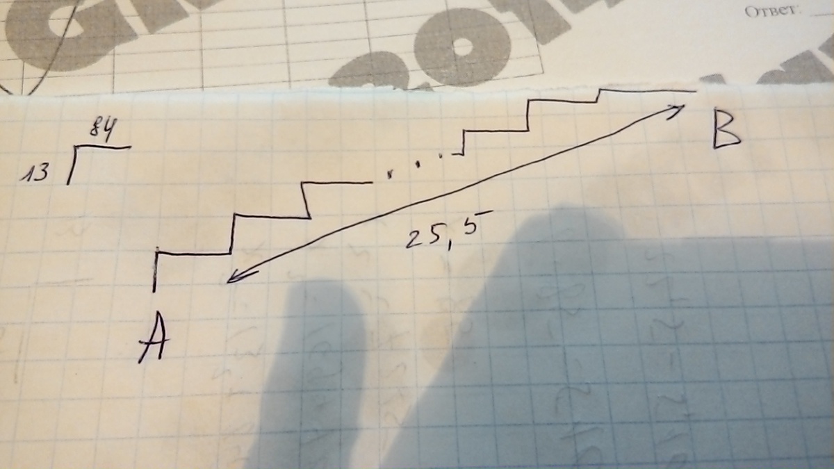 Лестница соединяет точки А и В. Высота каждой ступени равна 13 см, а длина 84 см. Расстояние между точками А и В составляет 25,5 м. Найдите высоту на которую поднимается лестница (в метрах)