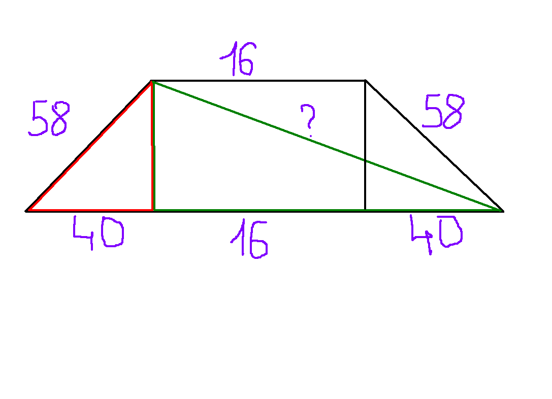 основания равнобедренной трапеции равна 16 и 96 боковая сторона 58. Найдите длину диагонали трапеции.