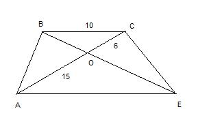 Рассмотрим треугольники АОЕ и ВОС. Они подобны по первому признаку подобия: два угла одного треуг-ка соответственно равны двум углам другого. В нашем случае углы ВОС и АОЕ равны как вертикальные, а углы ВСА и САЕ равны как накрест лежащие углы при пересечении параллельных прямых ВС и АЕ секущей АС.